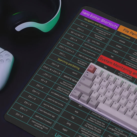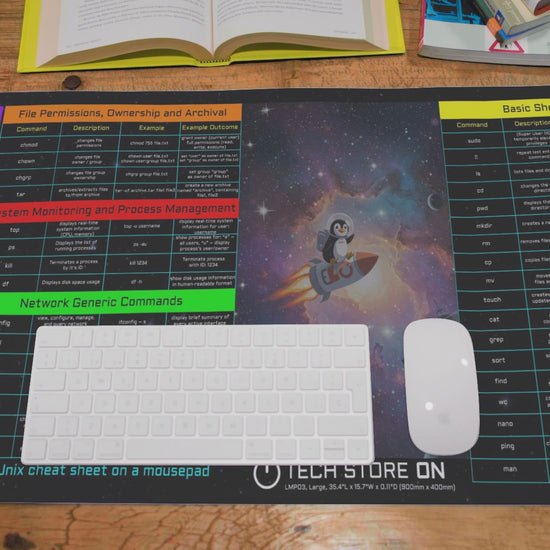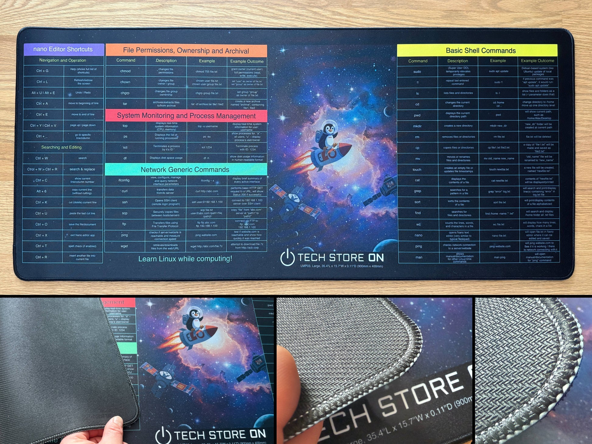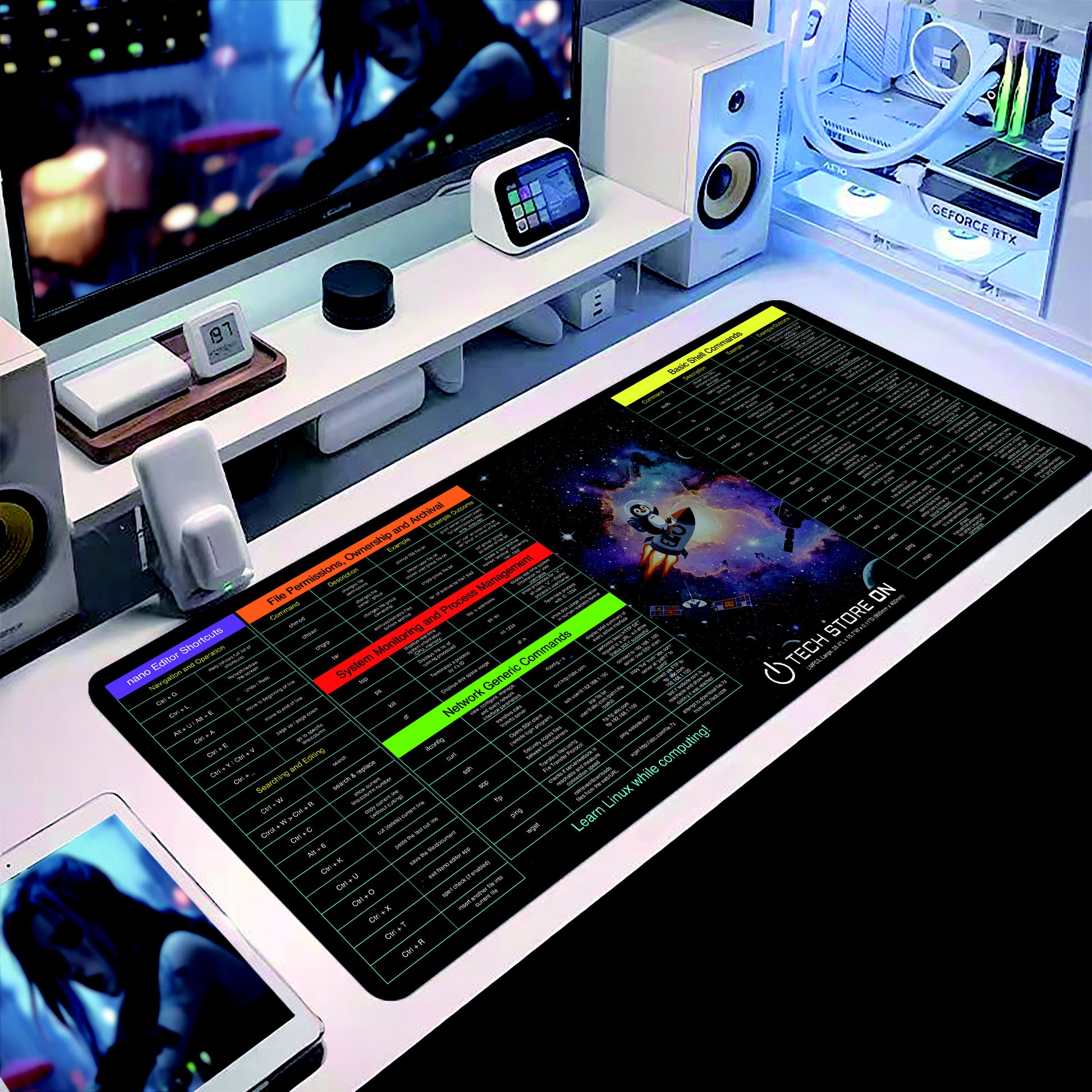 Hands-on Linux help, right where you work. This premium, non-slip mouse pad doubles as a quick-reference cheat sheet with real command examples and typical outputs—perfect for students, devs, sysadmins, and homelabbers.