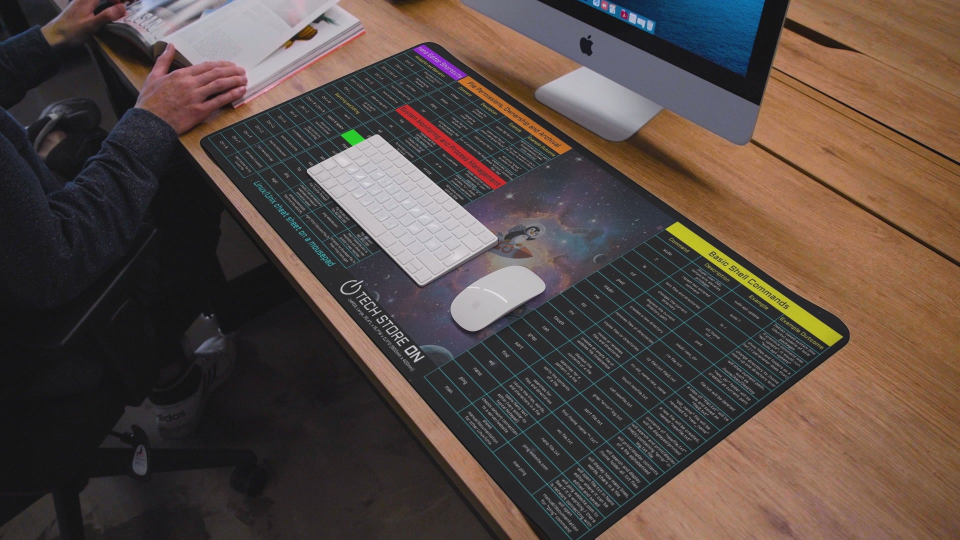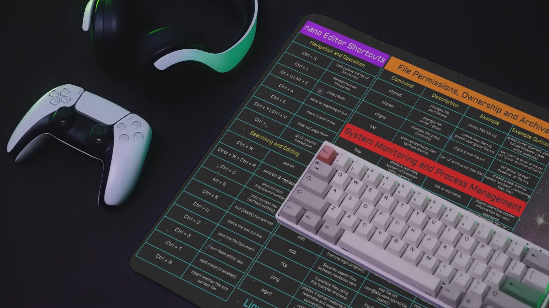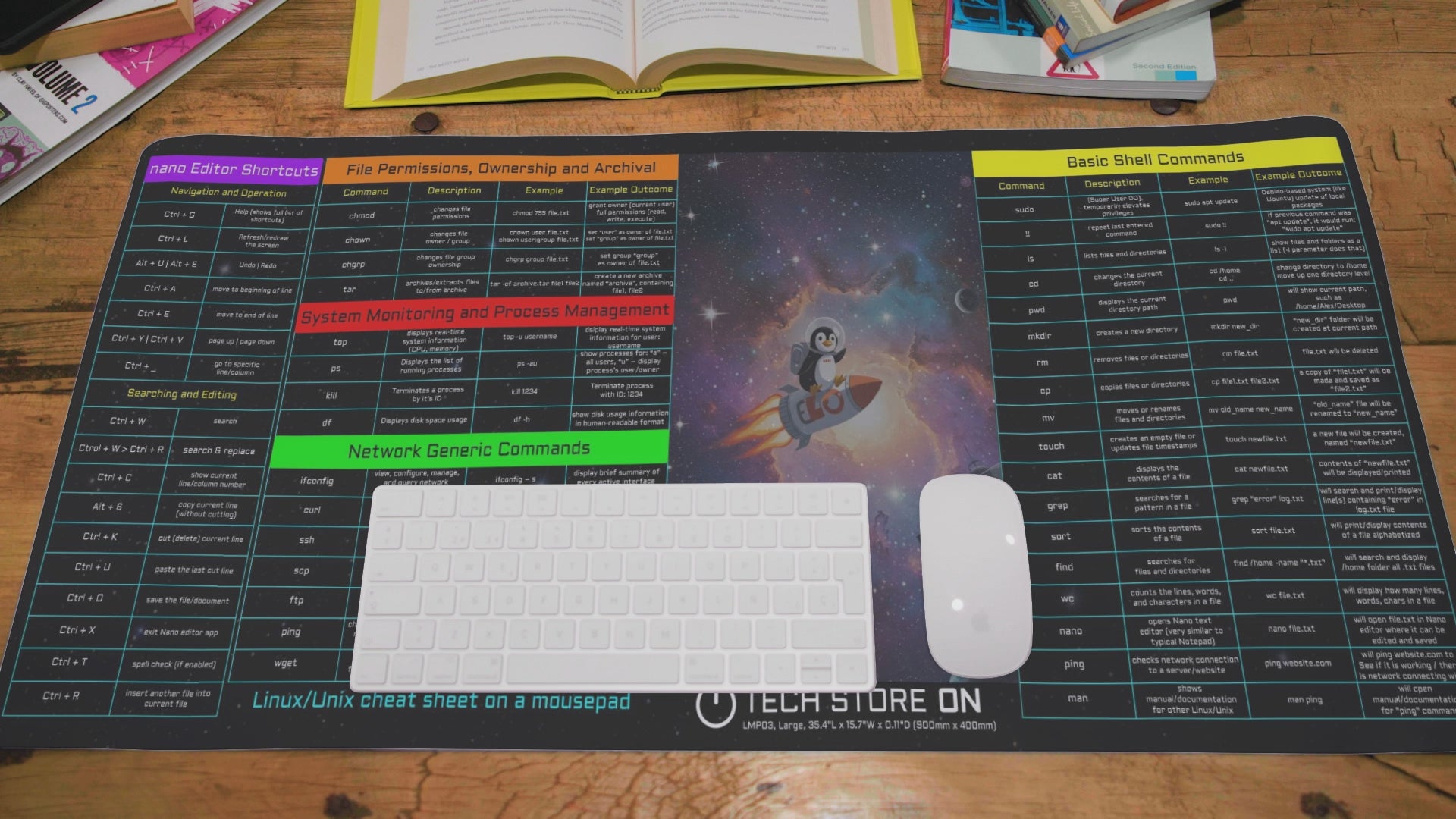 - Cheat-sheet mouse pad with Linux commands and sample outputs.