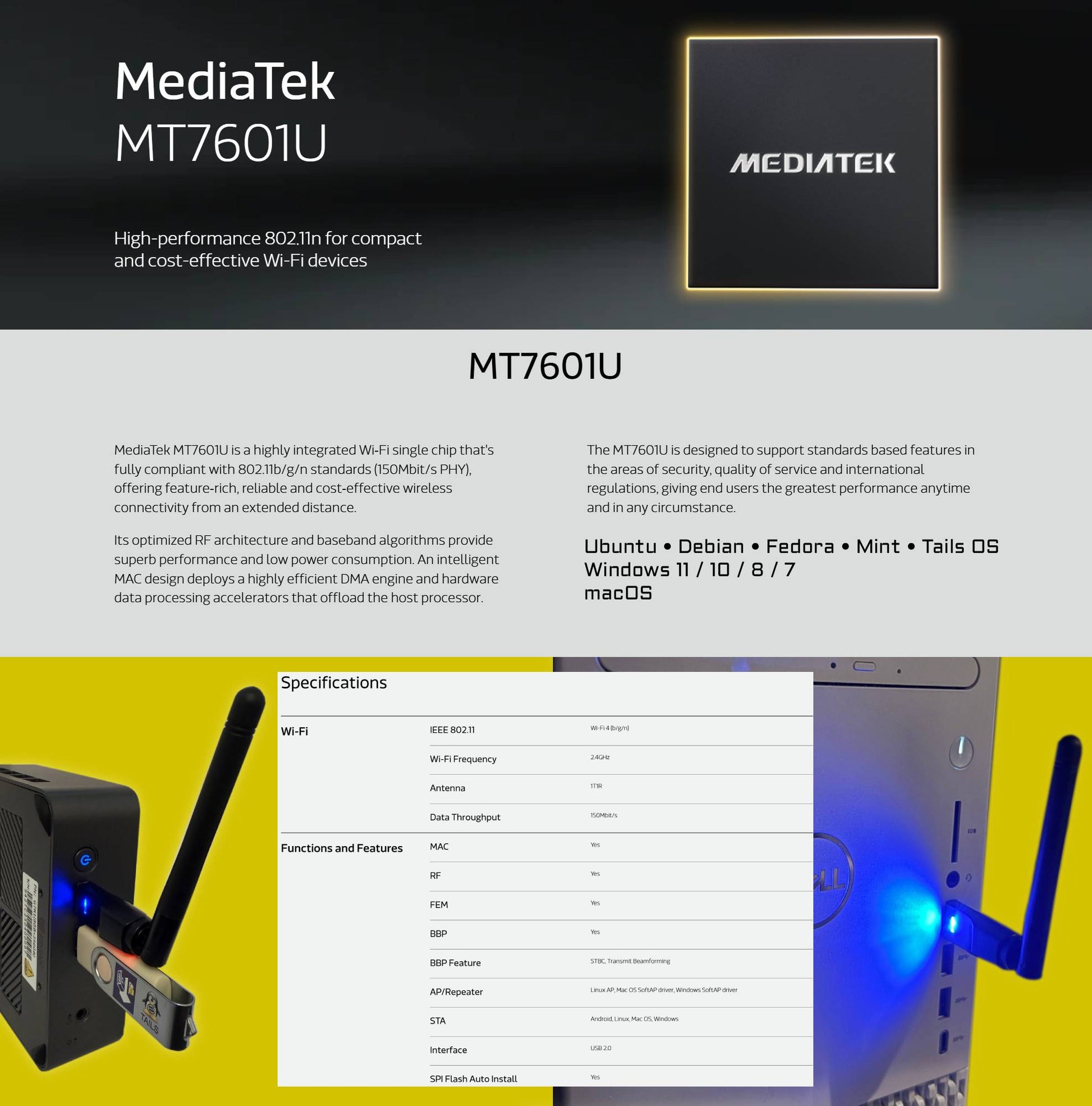 Wi-Fi USB Adapter for Linux (Tails, Ubuntu, Debian, Mint) – Plug & Play 2.4 GHz MT7601U Chipset